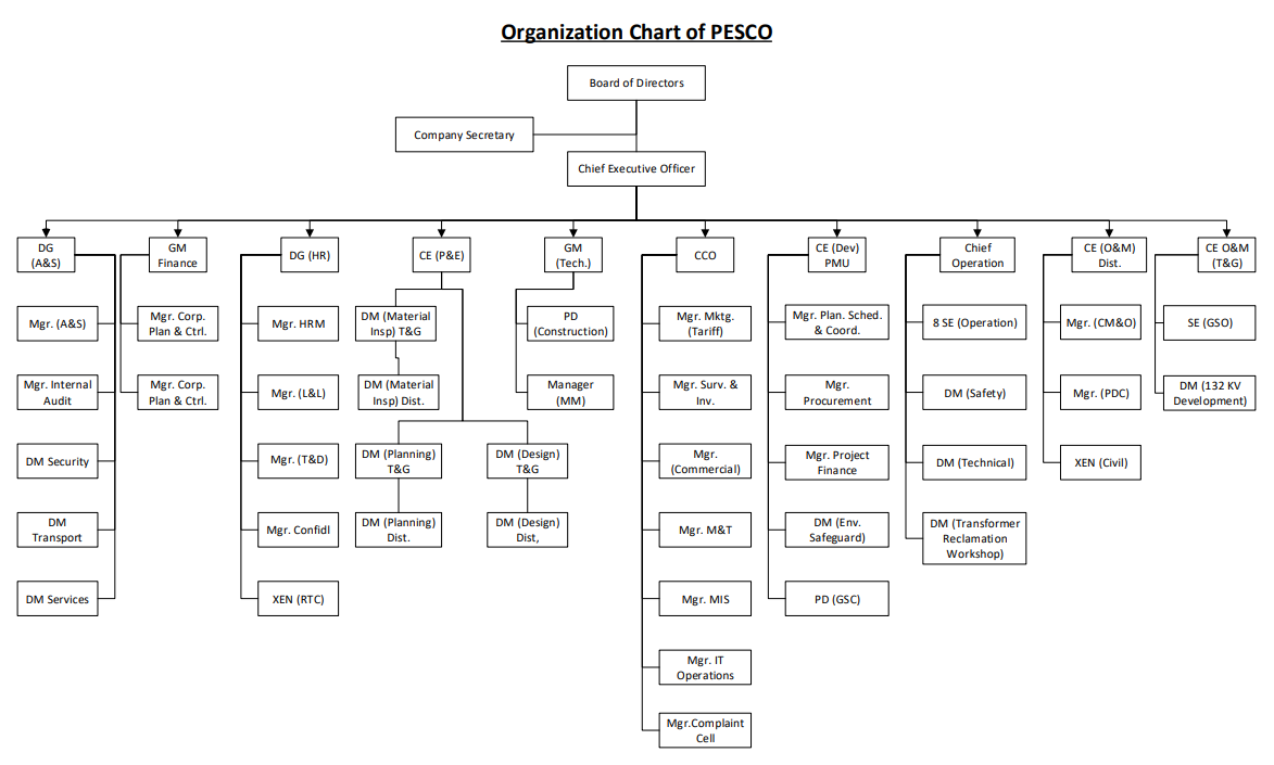 Here is useful information about the basic structure of Pesco Company. The Organization structure chart given below.